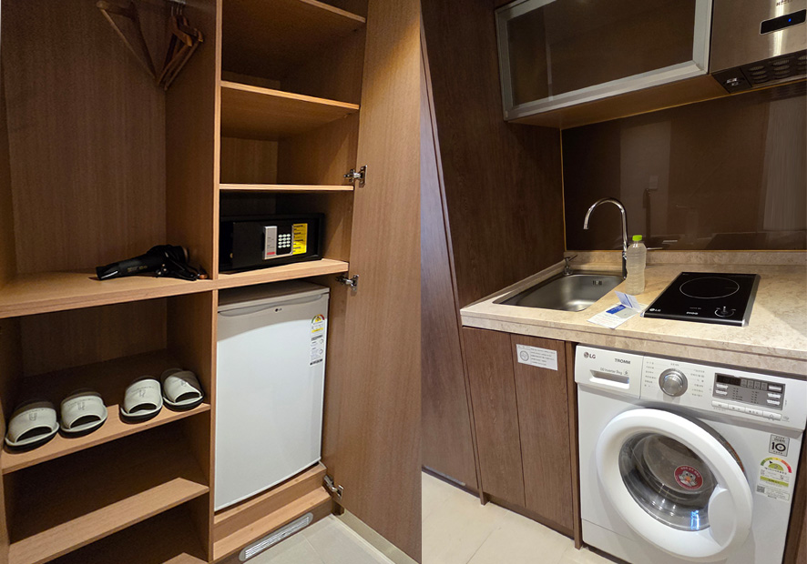 進房後右手邊是小廚房有流理台電磁爐與滾筒洗烘衣機,對於有烹煮需求的人可自費與飯店租用鍋具,沒錯~需要自費租用(純屬猜測大概是太多人,使用不清洗吧)緊接著則是衣櫃放著拖鞋與吹風機,特別一提這的吹風機風量還蠻大